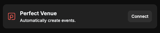 - On this page you’ll find our Perfect Venue Integration. If this is your first time, you should see a button that says Connect. Clicking on this button will open up a new web page for Perfect Venue Authorization Login.
